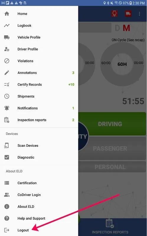 3. The application will not allow the driver to log out unless they are set to OFF DUTY