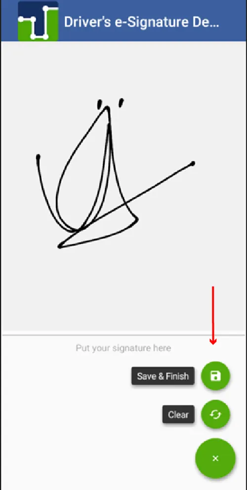 11. Then the screen appears for the driver to register your signature with your finger and you must press the symbol at the bottom right for SAVE & FINISH