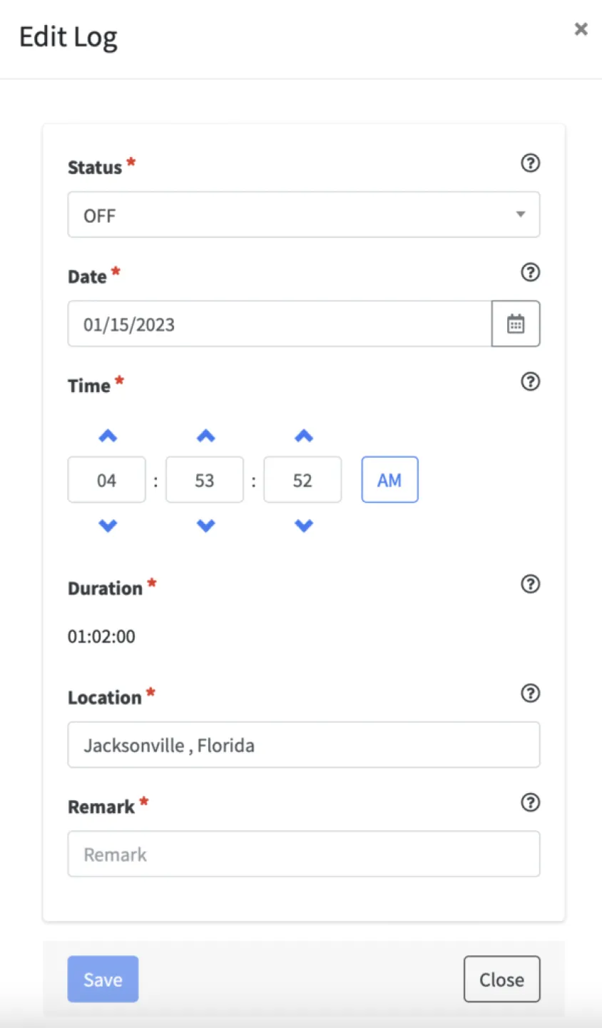 6. Click Save This change is called a Carrier Proposed Log Edit. This proposed change will be shared with the driver, who can decide to reject or assume the carrier proposed log edit. Specific information regarding carrier proposed edits can be seen under the Log Edits menu option.