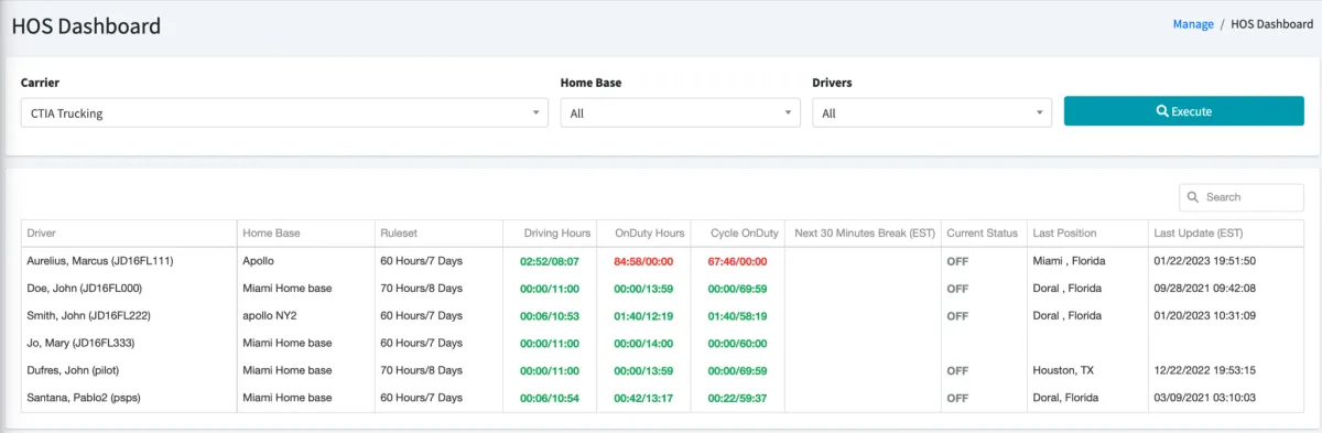 Hours of Service Dashboard: Shows all your drivers’ statuses as of the most recent ELD device check-in, including the following information: