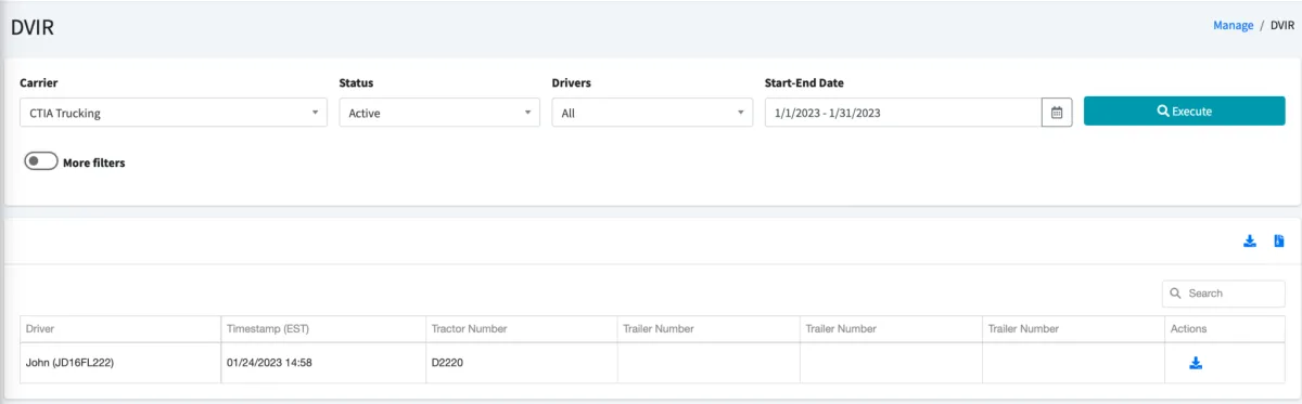 Actions shown next to each search result will allow you to download the DVIR report, either with or without pictures (if available):