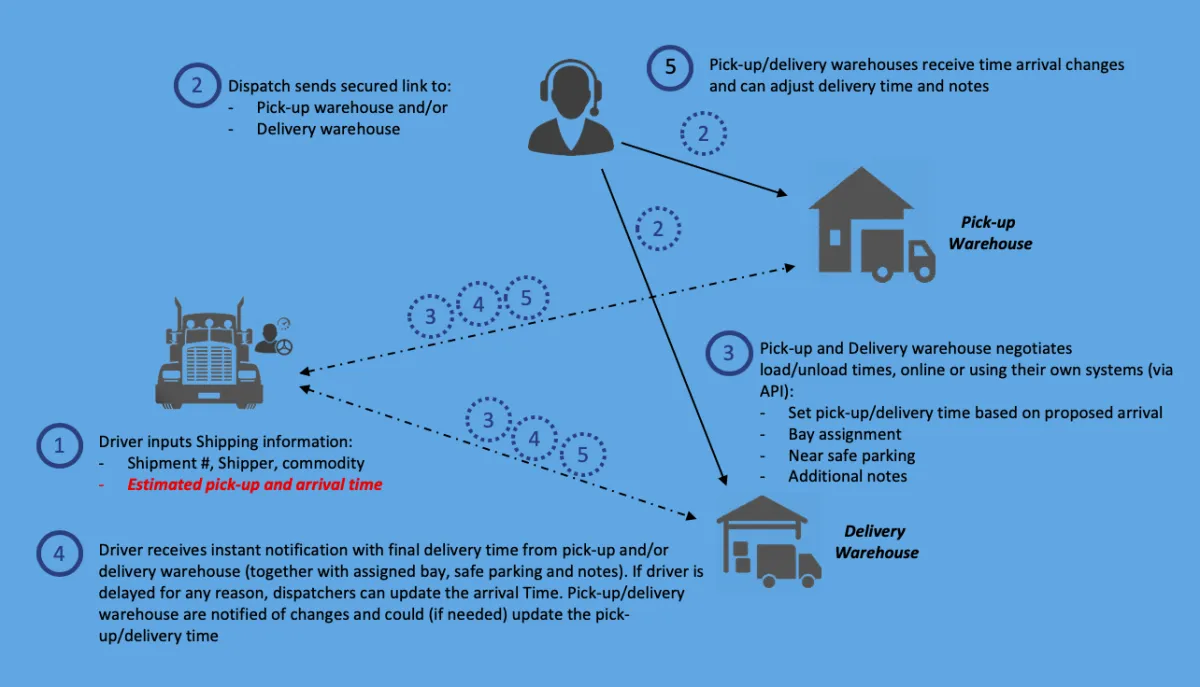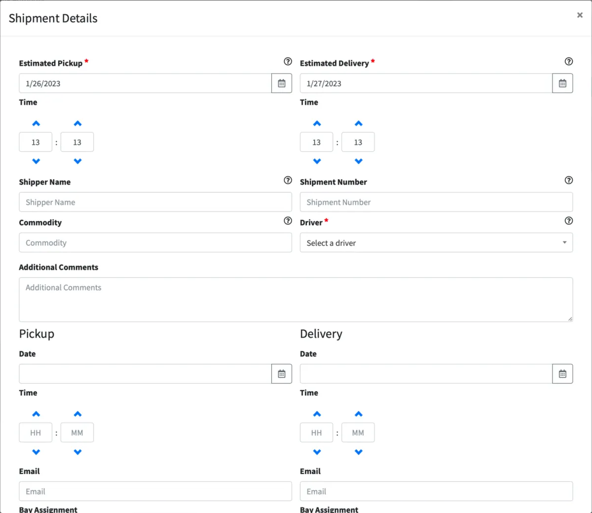 Shipment information can be shared with external organizations by entering the Pickup and/or Delivery information. Fill in the destination Email address for the shipper and/or receiver to share with them a link to this shipment. Warehouse personnel can make updates (like estimated arrival time, bay assignment, recommended parking, etc.) which are sent in a matter of seconds to the driver via the application and updated on the Portal.